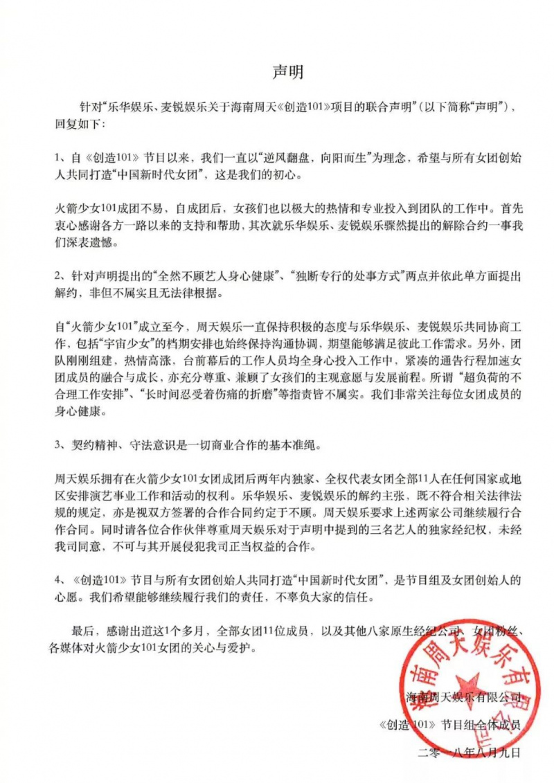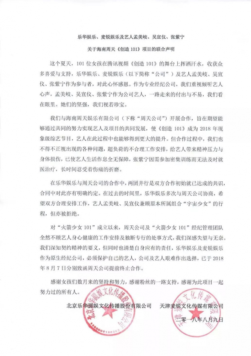 8月9日中午樂華娛樂以及麥銳娛樂在新浪微博發布了一條聯合聲明,宣布孟美岐、吳宣儀、張紫寧等三人退出火箭少女。