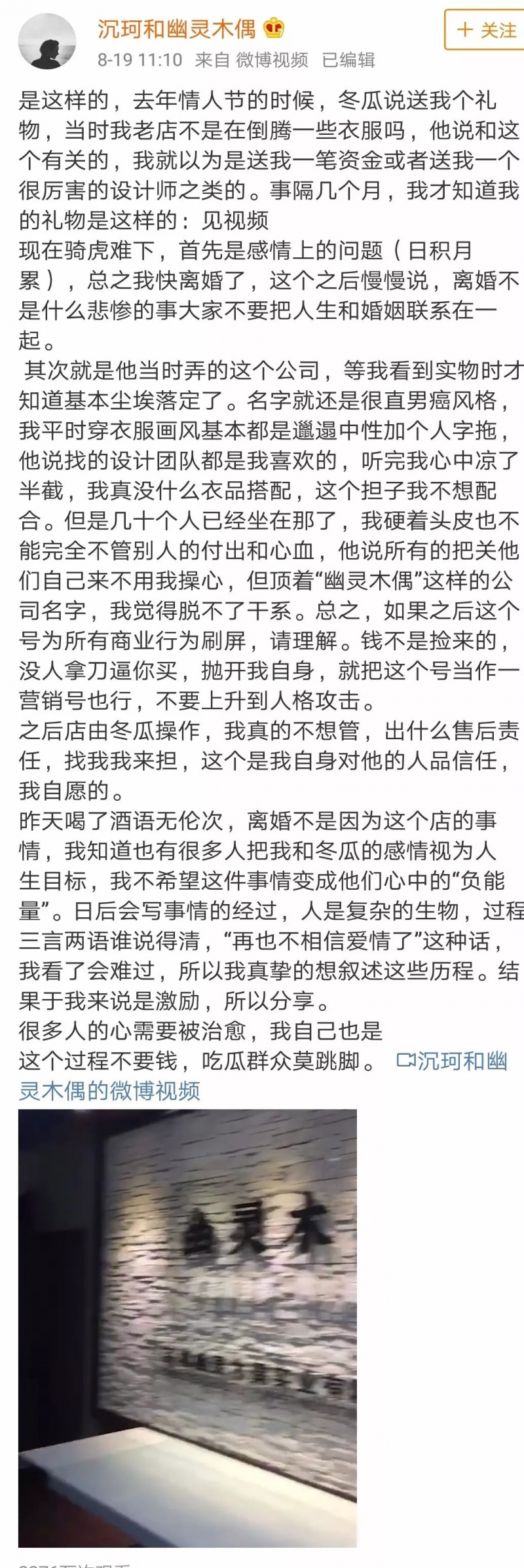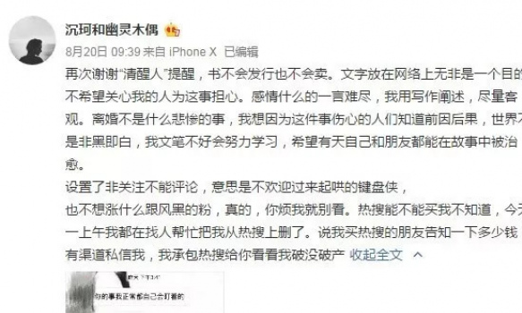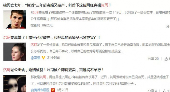 19號,沉珂發博表示“要離婚了”,很快上了熱搜前排。