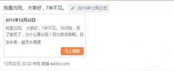 2015年,沉珂突然“死而複生”了,網名“幽靈木偶偶”,發了一篇長長的文章:7年不見了,我是沉珂。
