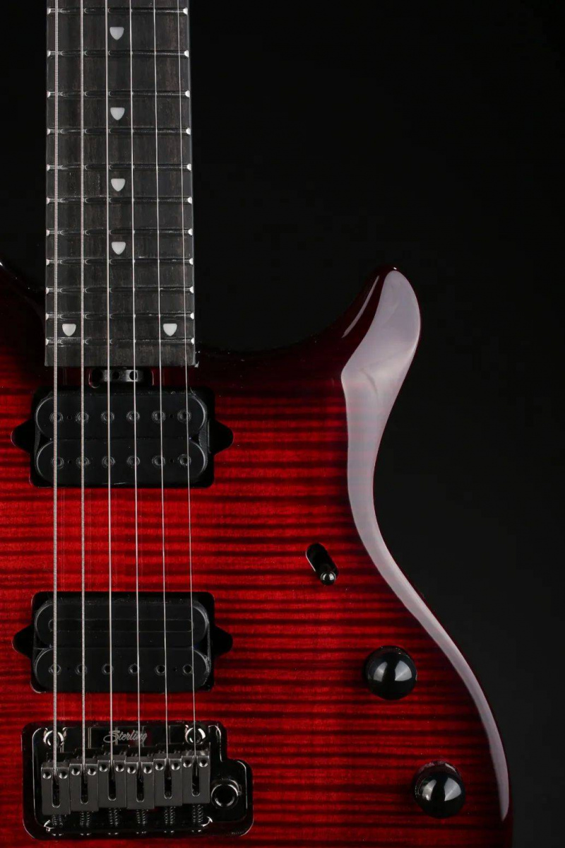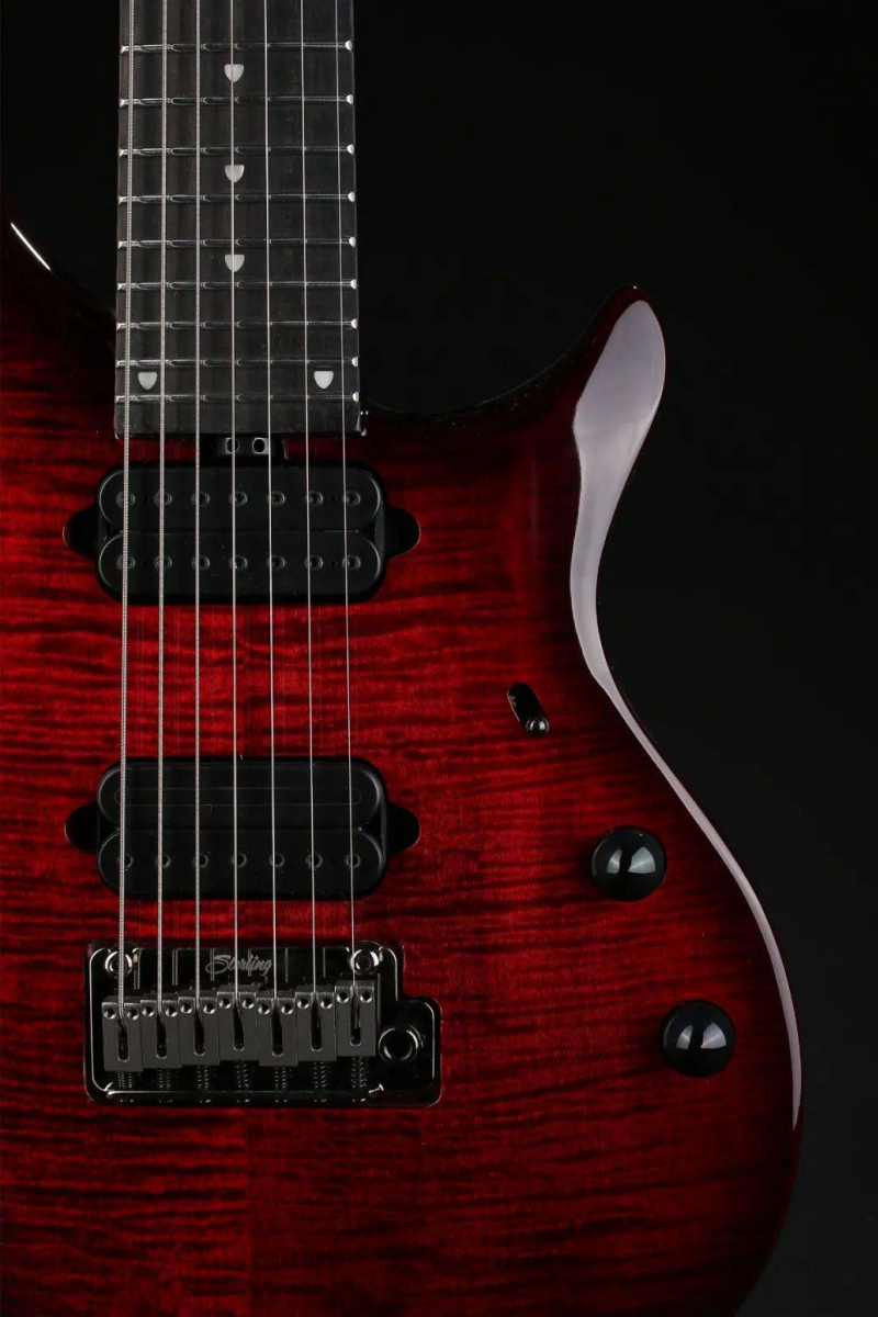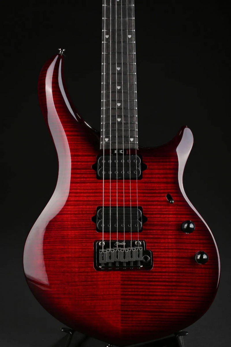 桃花心木琴體虎紋楓木貼面,桃花心木琴頸。全新的烏木指板搭配不鏽鋼品絲。不僅如此Sterling MAJ系列吉他還繼承了MUSIC MAN Majesty無與倫比的琴頸手感以及舒適的高把位切角。 DiMarzio拾音器