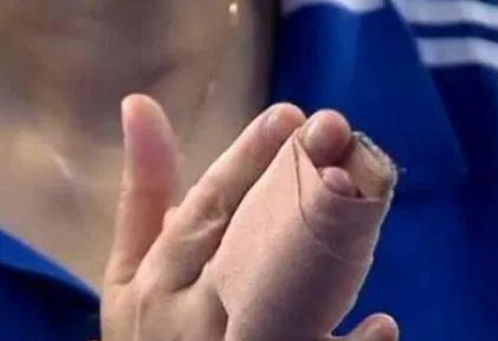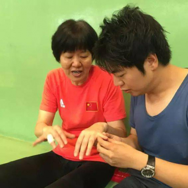 此圖為郎導是在訓練中被隊員擊球打傷手指。然而和藹的郎指導卻笑稱"這是隊員愛的表達"。