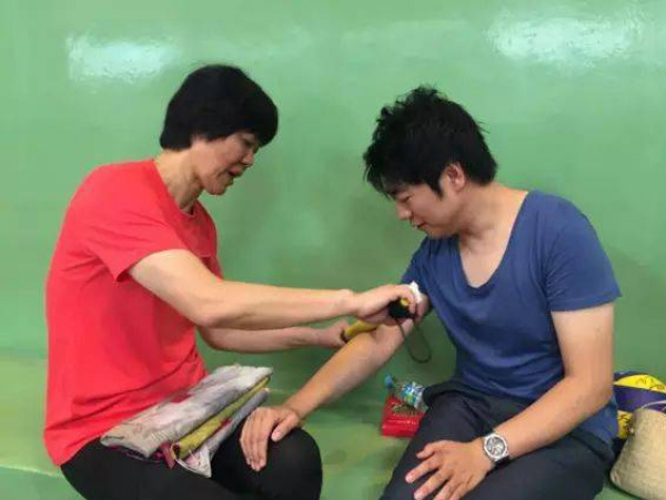 看到一位姑娘正拿按摩杖在身上來回滾,郎平也給郎朗做起了手臂按摩。