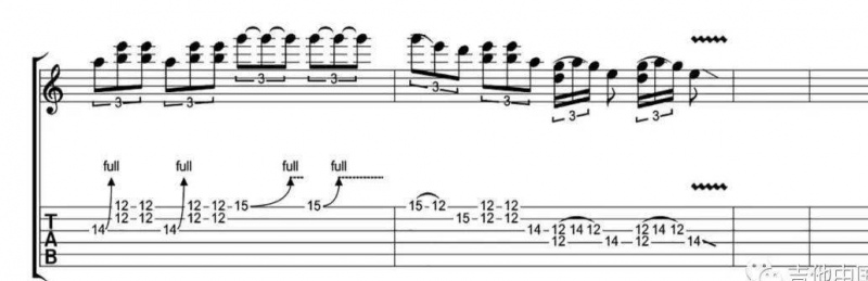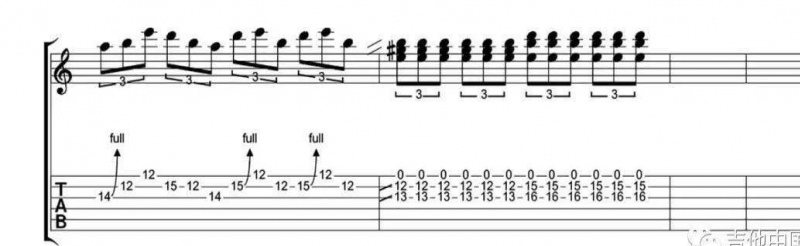 除了第一小節的五聲音階推弦演奏以外,SRV 還為他的演奏增加了和弦的色彩。和弦落在第二小節的前兩拍,其中包括了開放1弦的 E 音,2弦12品的 B 以及3弦13品的 #G 音,是一個 E 大和弦。第二個和弦則是沒有 #G 音的 E7 和弦。