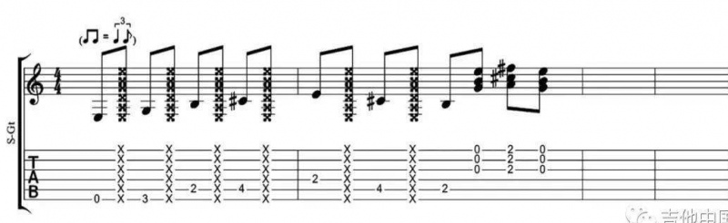 非常典型的 SRV 式 Shuffle 節奏,我們可以用三連音的感覺來演奏。首先將節奏分為兩個部分,一部分是音符,另一部分是悶音演奏。SRV 經常會在吉他 Riff 中使用這種技巧,這會增強整體的打擊感。不必擔心悶音時琴弦發出的細小雜音,在這種音樂中這更像是一種態度的體現。