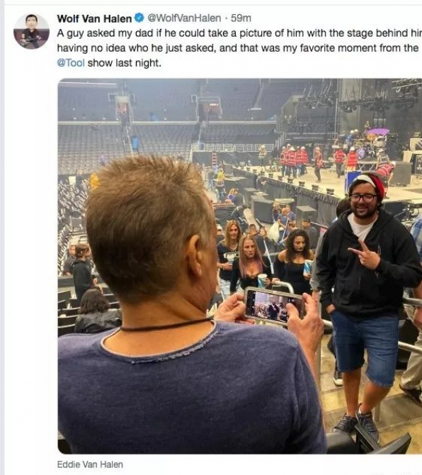 這一幕被一旁的 Wolfgang Van Halen 記錄了下來,隨後就發推說:“有人問我爸能不能把舞台當做背景來給他拍張照片,他肯定不知道他問的這人是誰,毫無疑問,這是昨晚 Tool 樂隊的演出中我最喜歡的時刻了。”